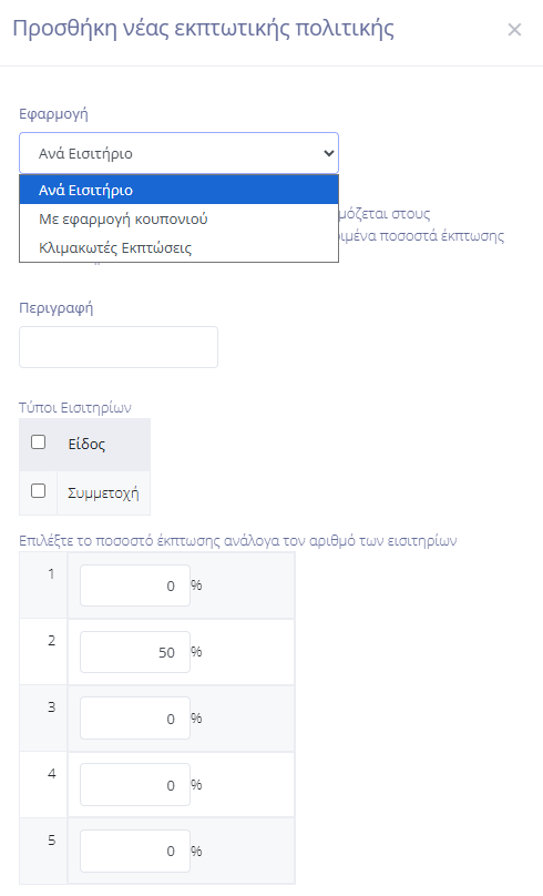 Από τη σελίδα των εκπτώσεων Εκδήλωση > Επεξεργασία > Τύποι Εισιτηρίων > Περισσότερα > Εκπτώσεις , μπορείτε να δημιουργήσετε μια νέα εκπτωτική πολιτική. Σε αυτή τη σελίδα έχει προστεθεί η δυνατότητα επιλογής τύπου εφαρμογής της έκπτωσης: