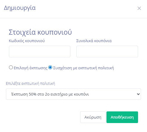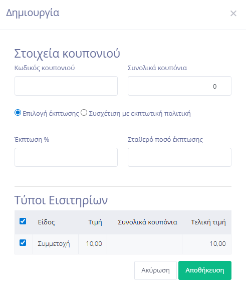 - Κλασικός τρόπος: Δημιουργία κουπονιού με σταθερή ή ποσοστιαία έκπτωση.