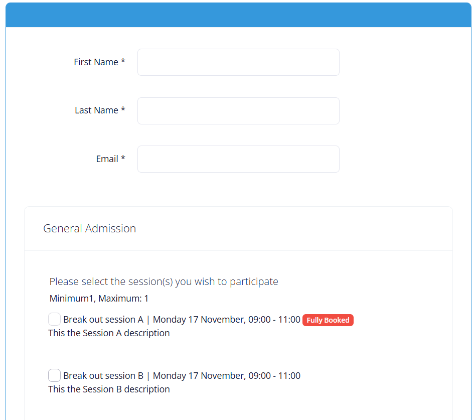 Here is an example registration form, where a session has reached capacity and is marked as fully booked: